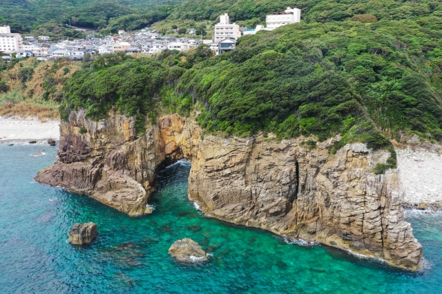 Ashizuri Cape is blessed with caves and domons formed by marine erosion, and Hakusan Domon is the largest of them, with a height of 16m and a width of 17m. It is one of the largest domons made of granite in Japan, and is designated as a natural monument of Kochi Prefecture. A promenade with stairs is maintained, and you can go down to the beach and see its figure up close.
