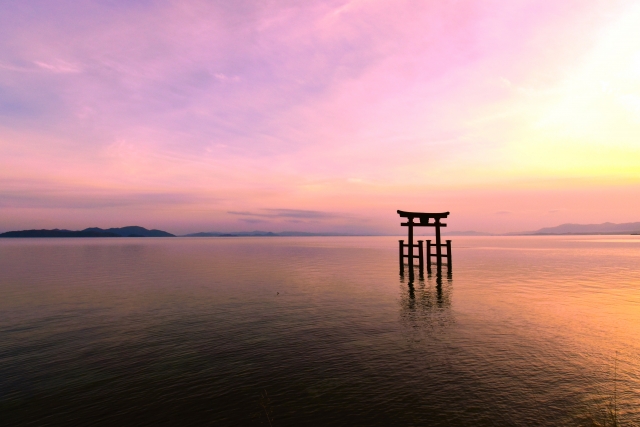 近江の厳島とも呼ばれる白髭神社は、名前の通り延命長寿、長生きのご利益があると言われており、更には縁結びや学業成就、交通安全など、人の営み事すべてを導く神でもあると言われています。水平線と沈む夕日を背景に湖につかる朱色の鳥居はとても美しく、幻想的な雰囲気を味わうことができます。