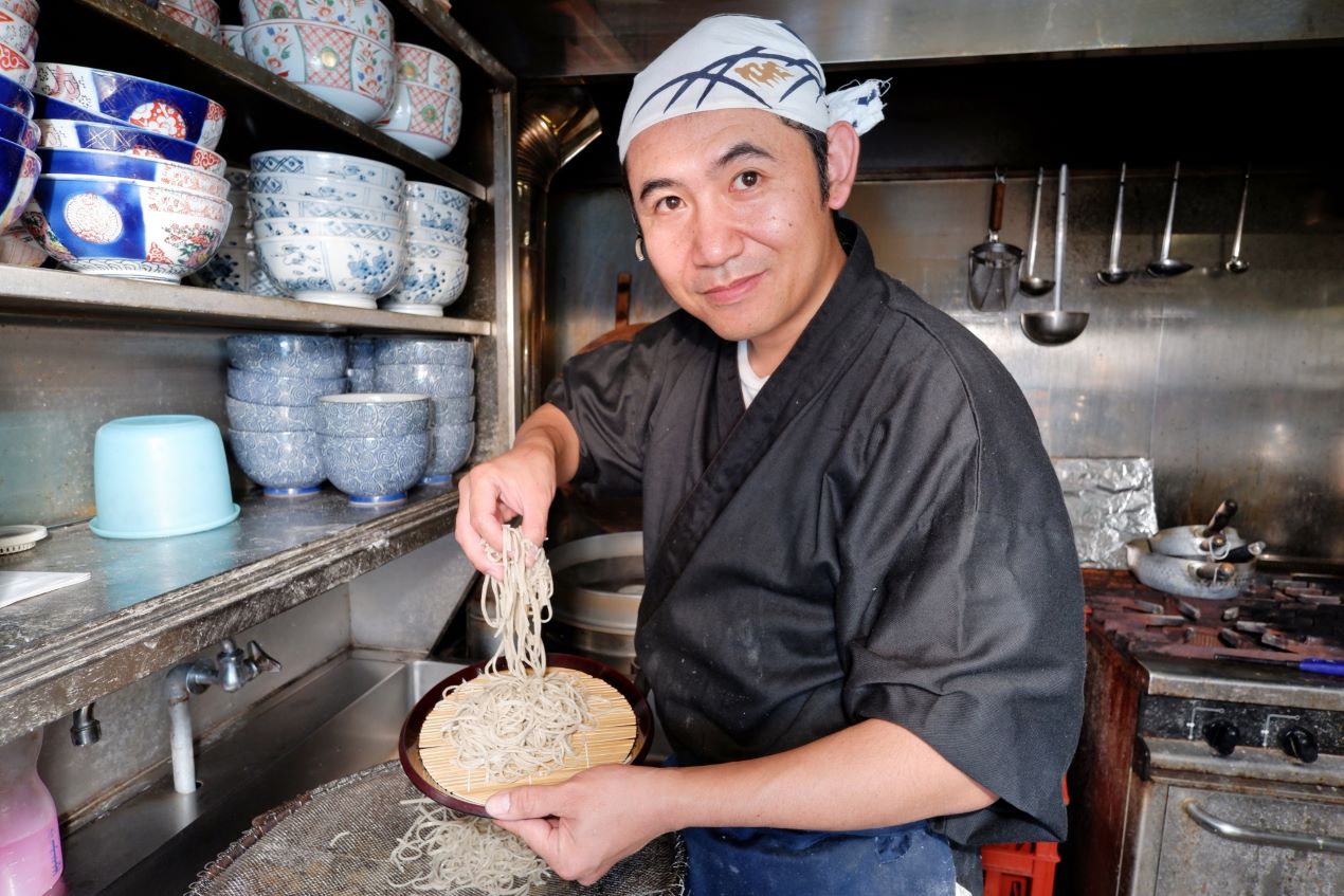 当店のそばは、北アルプスふもと更科で採れたそばを、石臼で粉にした一番粉です。味、香り共、絶品です。
