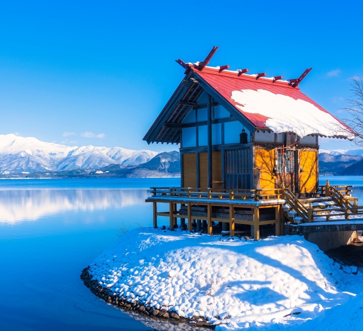 Ukiki Shrine is located on the jutting shore of Lake Tazawa. It is said to bring blessings of beauty, longevity, and love. Near the shrine is a golden statue of a dragon child.