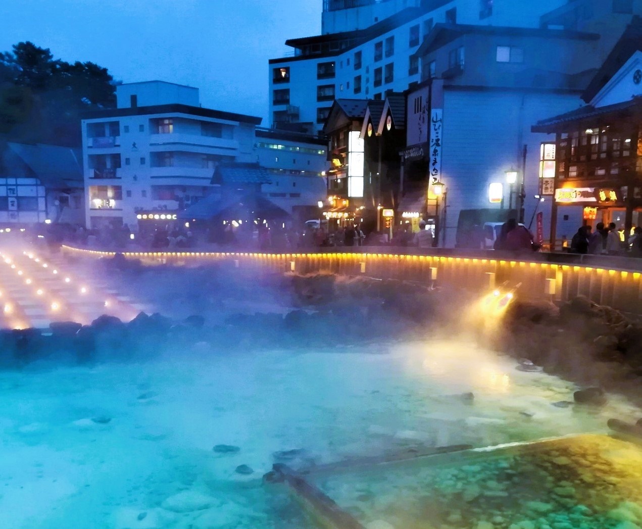 This Kusatsu Onsen boasts the largest natural hot spring in Japan. Visitors can enjoy the performance of "Yumomi," which lowers the water to a certain temperature until it is ready to bathe without losing its efficacy, and the view of the illuminated Yubatake hot spring fields.