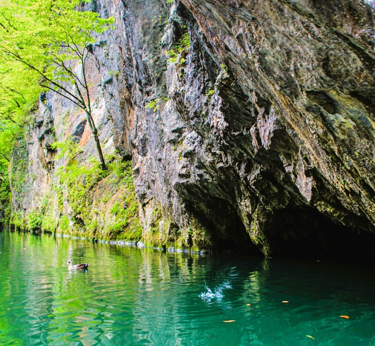 日本百景の一つ。流れは緩やかで舟下りを楽しむことができます。舟下り中は船頭さんの唄を聞くことができます。