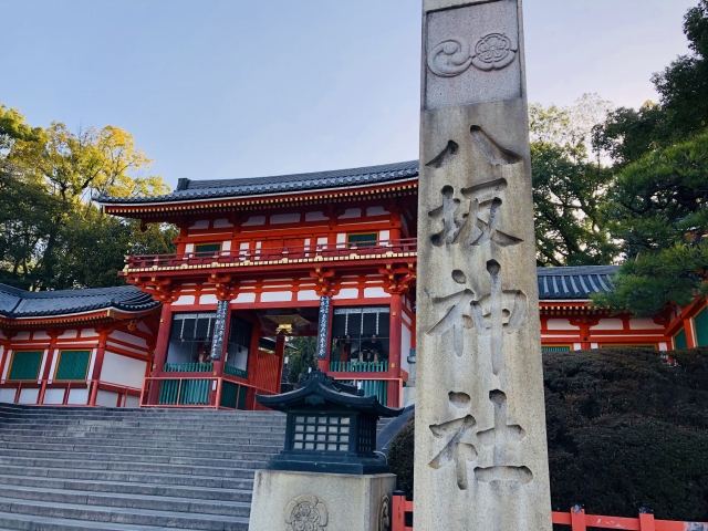 The main hall of Yasaka Shrine was designated as a national treasure in 2020, and there is a legend that a blue dragon lives there. It is also famous for matchmaking because it has Ōkuninushi Shrine that enshrines Ōkuninushi-no-Mikoto, and for plague prevention and warding off evil because Gozu Tennō is a plague god.