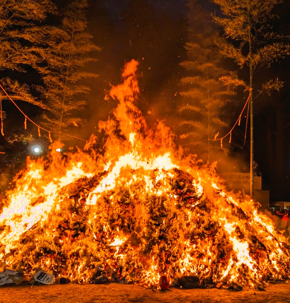 神社の境内で正月飾りや古神札などを焼き、御神火にあたって一年の無病息災や家内安全を祈願します。