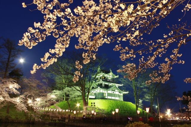 A cherry blossom festival in Joetsu City, Niigata Prefecture. It is held from early to late April. About 4,000 cherry trees bloom in Takada Park and its surroundings, which were built on the site of Takada Castle. The view of the cherry blossoms reflected in the moat is stunning. At night, they are lit up and create a fantastic atmosphere. During the cherry blossom festival period, there are also events such as warrior procession, tea ceremony, and concert. It is also known as one of the three best night cherry blossoms in Japan.