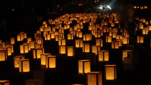 天の川まつりは、側面に願い事をかいた灯ろうを周辺の道路に並べて、ひとつひとつ火を灯します。無数に置かれた灯ろうが夜闇を照らす光景は神秘的で、まるで本物の天の川のようです。フィナーレでは願い事が叶うように祈った後、ひとつの炎として空に送ります。ほかにも盆踊りや花火なども打ち上げられ、幻想的な雰囲気を味わうことができます。