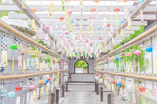 災いを取り除き、福を招くと言われている風鈴参道通り抜けでは、僧侶がひとつひとつ手塗りした約1500個の鮮やかな風鈴が風に揺られ、夏の訪れを知らせます。たくさんの風鈴の奥には本堂があり、また中にはオリジナルの風鈴を作ることができる体験コーナーもあります。完成した風鈴は境内に飾られます。