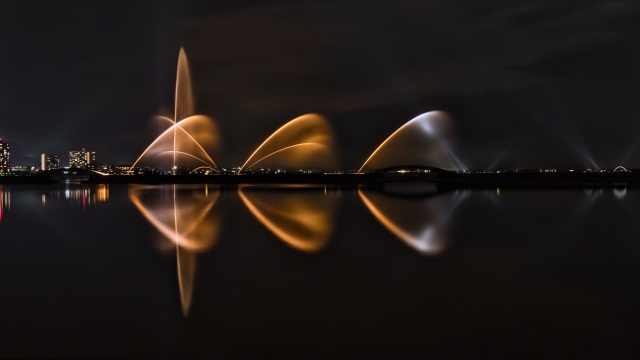 The Biwako Flower Fountain is a spectacular sight of water up to 40 meters high against the backdrop of Lake Biwa from a breakwater 180 meters offshore from Ōtsu Port. The fountain is lit up with transparent, orange, and green lights. The fountain is about 440 meters long and one of the largest in the world, so it is very impressive.