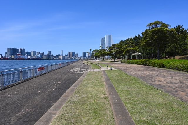 潮風公園は、品川区の臨海副都心にある都立公園です。レインボーブリッジや東京港を一望できる海沿いの遊歩道や、広々とした芝生広場、バーベキュー広場などがあります。2021年には東京オリンピックのビーチバレー競技が行われました。お台場海浜公園や船の科学館と隣接しており、一日中楽しめるスポットです。